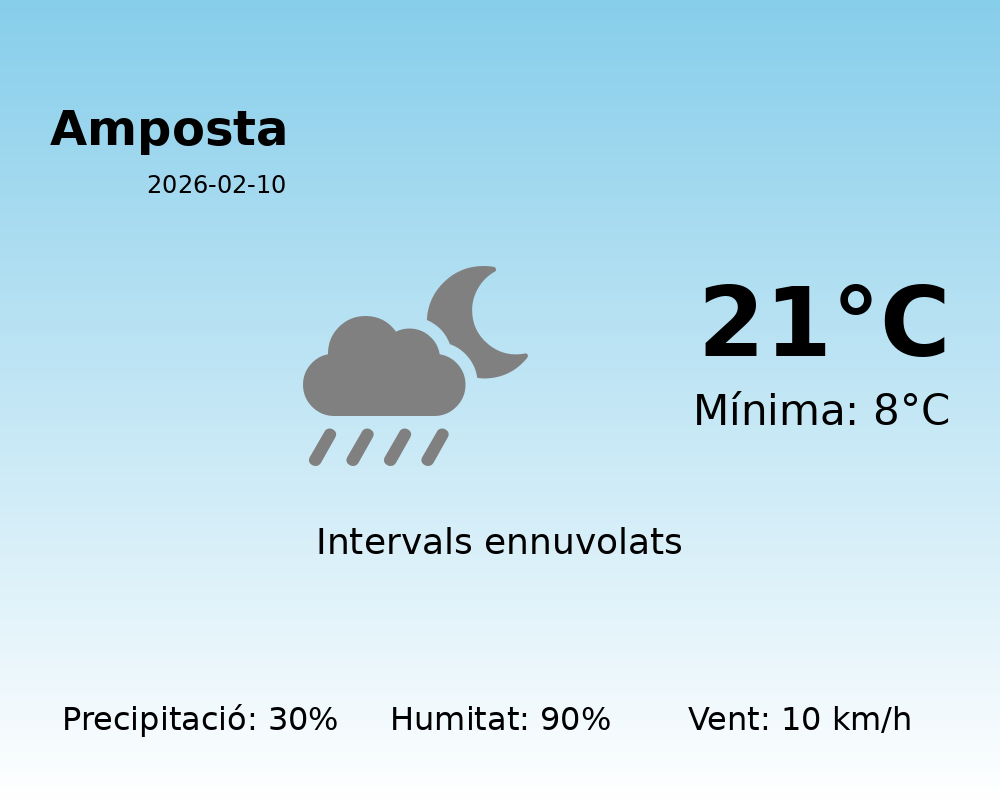 En resum, el dia d’avui a Amposta estarà marcat per un clima canviant, amb una combinació de núvols densos i risc de pluges. Es recomana estar preparat per a possibles xàfecs i aprofitar qualsevol clariana que pugui aparèixer.