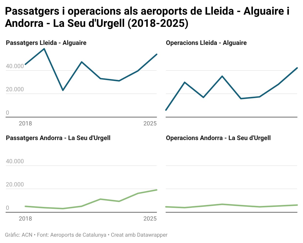 En total, 73.008 persones han fet ús d’aquestes infraestructures gestionades per la Generalitat, un 30% més que l’any 2024, mentre que el nombre d’operacions de vol s’ha situat en 48.394 (+45%). Aquest creixement s’explica, principalment, per l’augment de l’activitat a l’aeroport de Lleida–Alguaire, que concentra la major part de les operacions i passatgers, així com per l’evolució positiva de l’aeroport d’Andorra–La Seu d’Urgell, que continua consolidant les seves connexions regulars.