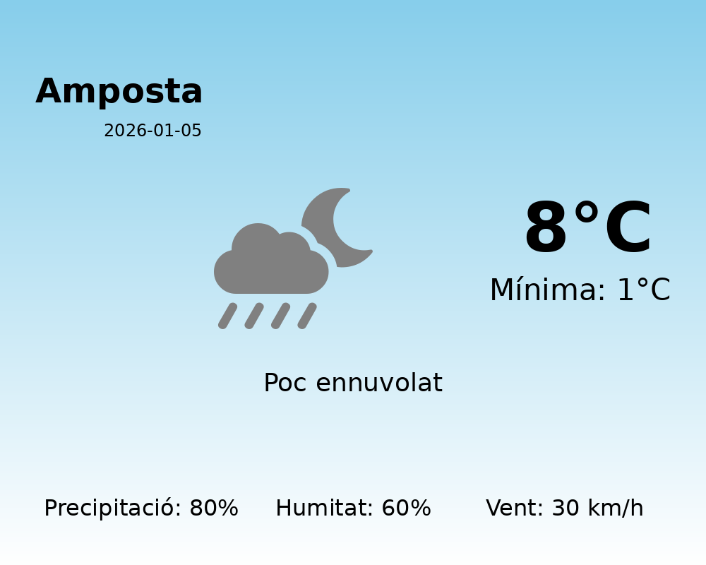 L’estat del cel es presenta amb un codi de 12, indicant la presència de núvols significatius. A més, hi ha una probabilitat de precipitació del 80%. Això significa que hi haurà pluges durant la major part del dia, així que porteu el paraigua si heu de sortir.